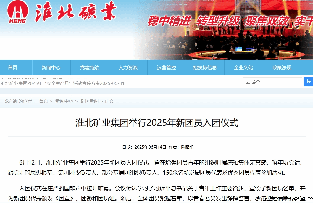 6月12日,淮北矿业集团在我院举行2025年新团员入团仪式,旨在增强团员青年的组织归属感和集体荣誉感,筑牢听党话、跟党走的思想根基。集团团委负责人、部分基层团组织负责人、150余名新发展团员代表及优秀团员代表参加活动。